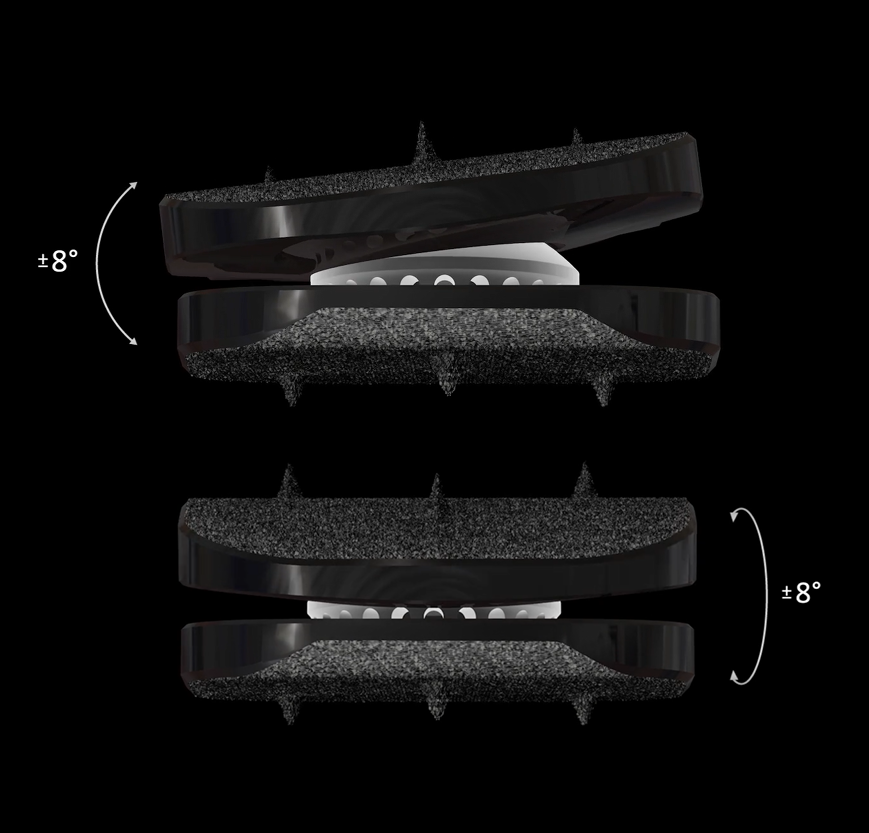 Le noyau mobile en PE est conçu pour éviter les contraintes excessives sur les facettes articulaires postérieures. Il offre une liberté de mouvement de 6°.